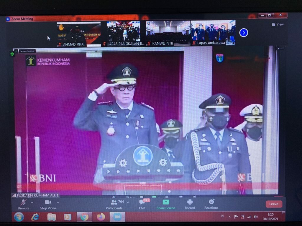 Pangkalan Bun – Seluruh Pegawai Lembaga Pemasyarakatan Kelas IIB Pangkalan Bun mengikuti Upacara Puncak Peringatan Hari Dharma Karya Dhika (HDKD) ke-76 Tahun 2021 dengan mengusung Tema “Semakin Pasti” yang dilaksanakan secara Virtual melalui aplikasi Zoom Meeting. Sabtu (30/10/2021).